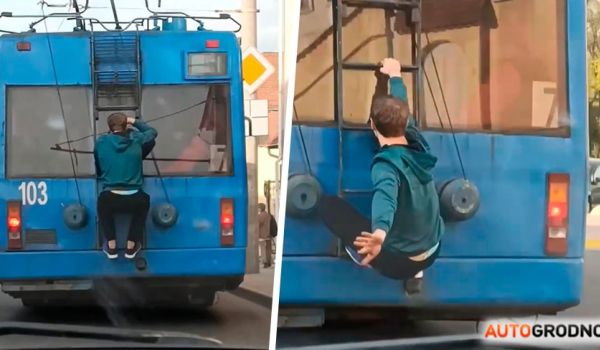 Время от времени в Гродно появляются "зацеперы". Это подростки, которым не хватает острых ощущений и они цепляются за лестницу, торчащую позади троллейбусов, чтобы прокатиться так остановочку-другую. Один из таких "экстремалов" засняли в центре Гродно наши читатели.