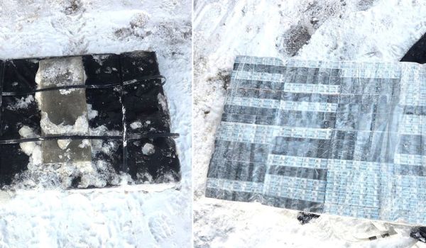На "плоту", замаскированном под снег и лед, пограничники Капчиамиестиса обнаружили 640 пачек белорусских сигарет.
