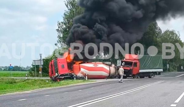 Дополнено: у бетономешалки стали взрываться колеса, это засняли на видео. Прямо сейчас, 3 июня в 14:40, на трассе P99 (поворот на Свислочь), произошло ЧП. На перекрестке столкнулись два грузовика, один из которых опрокинулся на бок и раздавил легковой автомобиль.