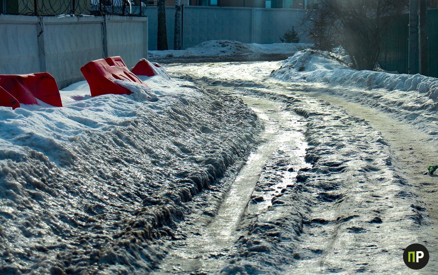 Поверхность тротуаров покрыта не просто снегом, а плотной коркой льда – надолбами, которые образовались после замерзания влаги.